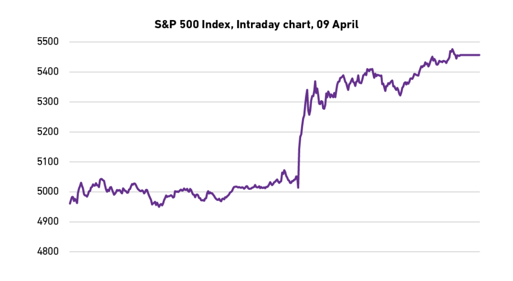 The impact the on the US equity market was a 9.5% move up on Thursday. It was one of the biggest one-day moves ever and leaves the US stock market less than 4% down from its level on 2 April when the tariffs were first announced. As we write, the Asian and European markets are following suit. Even still, market volatility remains elevated and investors remain nervous.