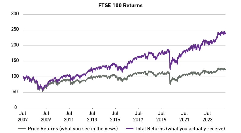 The impact of dividends is that, since 2007 (the peak of the market before the financial crisis) about 80% of the market’s returns have come from the dividends (see chart below). This includes a banking crisis, the Eurozone crisis, Brexit and a global pandemic. All through this, returns were being made to shareholders. However, the news only talks about the price return (just 20% of the total return in this period). Listening to the news can seriously impact your financial health.